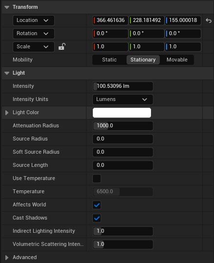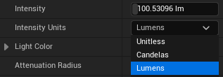 Attenuation controls how far a light's influence extends. All distances in Unreal are in centimeters (1 Unreal Unit = 1 cm).