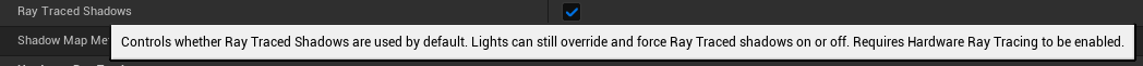 Hardware Ray Traced shadows use your GPU's RTX/DXR hardware to physically trace shadow rays. This produces the most accurate results but requires compatible hardware.
